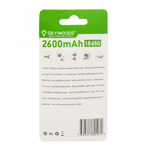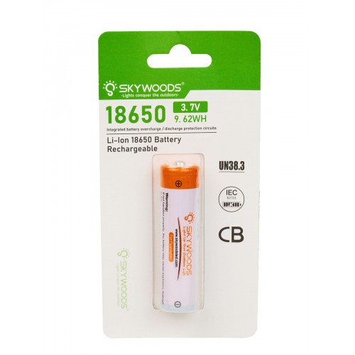 Литий-ионный аккумулятор SKYWOODS тип – 18650, наиболее распространенный вид аккумуляторных батарей подходящий для широкого сектора устройств, таких как ручные, налобные и подводные фонари, триммеры, электроинструменты, пауэрбанки и другие устройства.