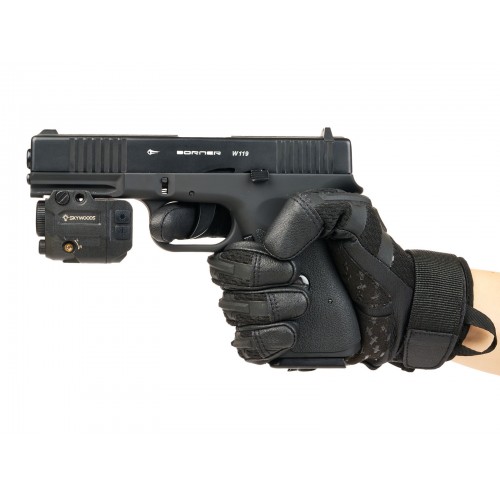 Пистолетный фонарь SKYWOODS MERLIN с ЛЦУ, мощностью 340 люменов. Имеет степень защиты от влаги IP66, что позволяет эксплуатировать фонарь под водой на глубине до 1-ого метра. Дальность светового потока составляет 160 метров. Удобная магнитная зарядка. Установлен 1 светодиод XF-S23W. Фонарь оснащен кнопками управления с обеих сторон, поэтому будет удобен как для правшей, так и для левшей. Установлено быстросъемное крепление на планку Weaver. Лазерный указатель регулируется по вертикали и горизонтали. Белый свет.