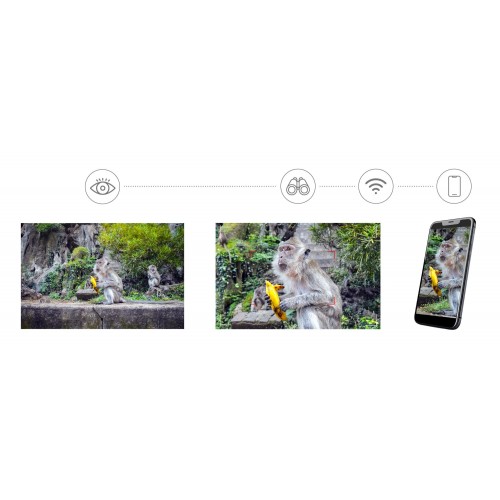 Рассматривать мир при помощи фотобинокля можно как в одиночку, так и с единомышленниками – нужно всего лишь включить Wi-Fi. Мобильное приложение позволяет транслировать изображение на 3 смартфона одновременно, а также вести с их помощью фотосъемку – при совместной работе шансы упустить интересный кадр практически равны нулю!