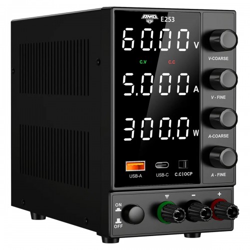 Источник питания AMO E253 — это профессиональное устройство с регулируемым выходом постоянного тока, разработанное для применения в промышленной автоматике, телекоммуникациях, сервисных центрах, учебных лабораториях и научно-исследовательских учреждениях. С диапазоном регулировки напряжения от 0,01 до 60 В и тока от 0,001 до 5 А, прибор обеспечивает максимальную выходную мощность 300 Вт, что позволяет стабильно питать широкий спектр оборудования — от промышленных датчиков и контроллеров до систем видеонаблюдения и радиоэлектронных плат.