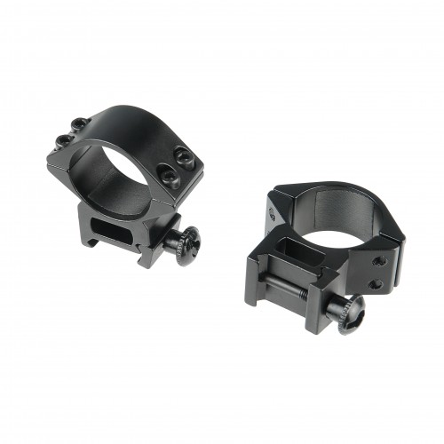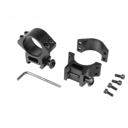 Выполненные из алюминиевого сплава, кольца для прицела сочетают прочность и небольшой вес. Для фиксации на планке используются прижимные винты. Каждое кольцо фиксируется четырьмя винтами с помощью ключа-шестигранника (входит в комплект).