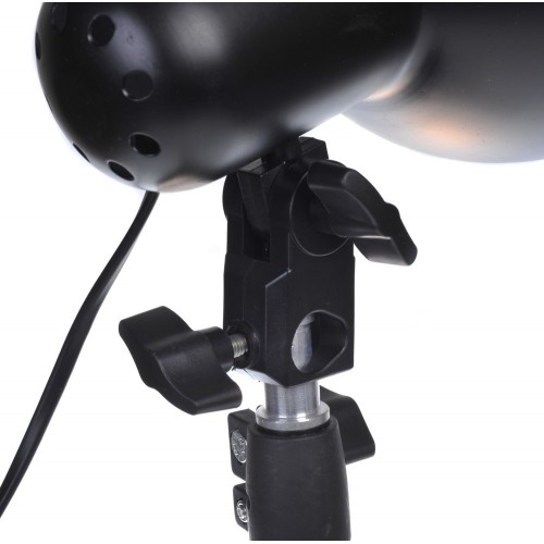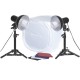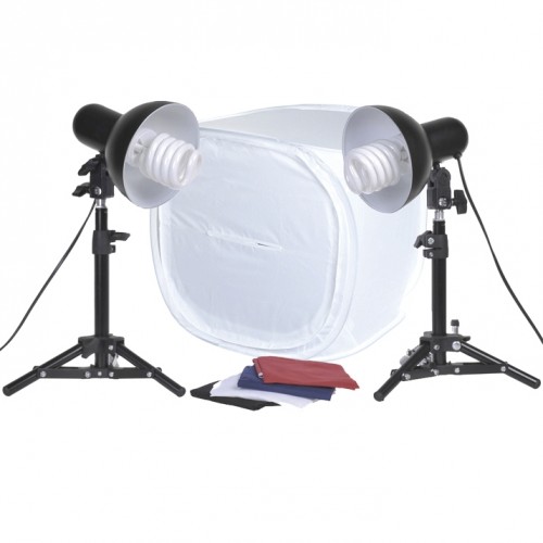 Фотобокс размером 40х40х40 см с матовыми полупрозрачными стенками дает возможность бестеневого освещения объекта, а одновременное использование двух источников постоянного света позволяет правильно оценить рисунок освещения. Осветители из комплекта рассчитаны на использование с флуоресцентными лампами с цоколем E27, в комплекте 2 лампы мощностью по 40 Вт (эквивалент, цветовая температура 5500К). Для установки осветителей в комплект входят две стойки высотой 40 см.