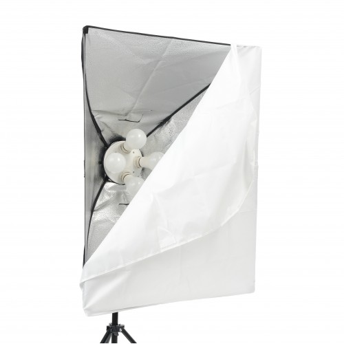 Прямоугольный cофтбокс размером 50х70 см и глубиной 40 см натягивается при помощи 4-х металлических спиц с наконечниками – один конец спицы вставляется в отверстие на корпусе ламповой панели, а другой конец в кармашек купола. Купол софтбокса изготавливается из специальной ткани с серебристой фактурной светоотражающей внутренней поверхностью, которая является рефлектором. В комплект софтбокса входит тканевый рассеиватель, который надевается на передний край софтбокса и приклеивается на липучки. Софтбоксы быстро собираются и разбираются, упаковываются в чехол.