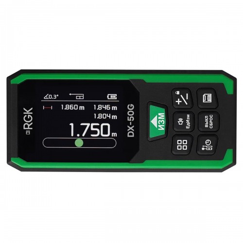 Лазерный дальномер RGK DX-50G – профессиональный комбинированный измерительный инструмент строительного назначения с рабочим диапазоном до 50 м, снабженный интегрированным инклинометром, встроенной памятью и цветным графическим дисплеем. Прибор проецирует зеленый маркер, по которому визуально контролируется местоположение точки наведения в ходе замеров. Он лучше различим на ярком солнце, благодаря чему инструмент является оптимальным выбором для работы на открытых площадках.