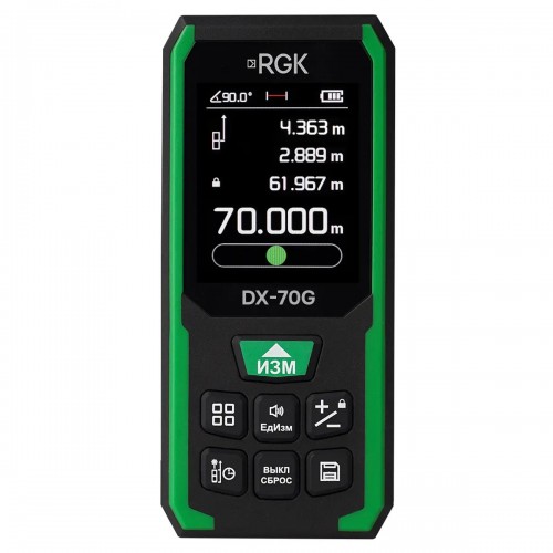 Строительный лазерный дальномер RGK DX-70G, помимо стандартных для своего класса инструментов режимов, обеспечивающих определение площадей, объемов, выполнение косвенных измерений и простых вычислений, дополнительно реализует функцию разметки и электронного пузырькового уровня. Показания автоматически сохраняются во внутренней памяти на 100 ячеек, которая циклически перезаписывается после полного заполнения.