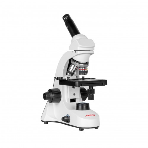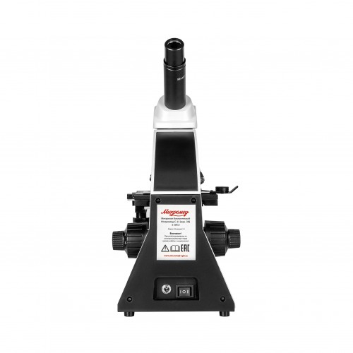 Микроскоп оснащен монокулярной визуальной насадкой, допускающей поворот вокруг оптической оси на 360°, что позволяет установить ее в удобное для работы положение. Поворотная конструкция позволяет настраивать рациональное положение окулярного тубуса при манипуляциях с исследуемым образцом, что особенно удобно в учебном процессе при наблюдении несколькими учащимися одновременно. Угол наклона окулярного тубуса составляет 45°.