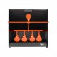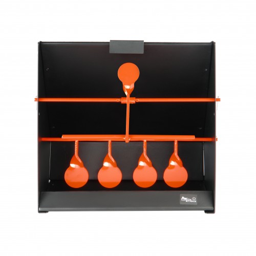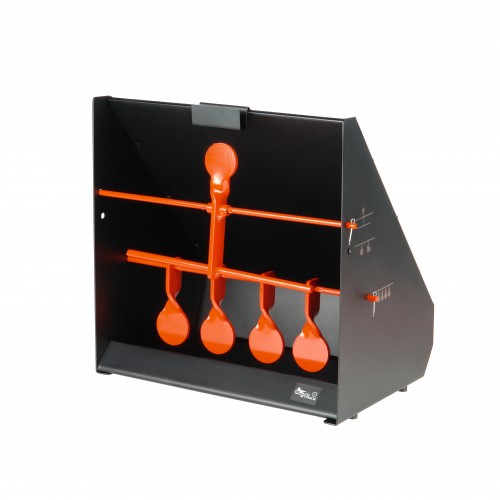 Миниатюрный тир оснащен ярко окрашенными металлическими мишенями на 5 целей, подвешенными на перекладине. При точном попадании мишени проворачиваются вокруг оси, создавая хорошо слышимый металлический щелчок. Такая реакция цели позволяет вести скоростную стрельбу без необходимости ручного возврата мишеней в исходное положение.