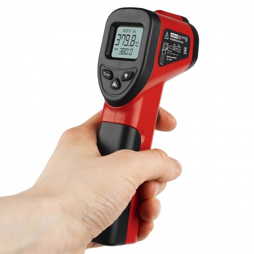 Для комфортного считывания показаний при выполнении работ в слабоосвещенных местах ЖК-дисплей пирометра снабжен подсветкой, которая включается и выключается отдельной кнопкой. В качестве источника питания в приборе используются 2 щелочные батарейки популярного типоразмера AAA. В рабочем положении они размещаются в пистолетной рукоятке под откидной крышкой и могут быть быстро заменены без использования инструментов. В случае 15-секундного бездействия в измерителе активируется функция автоотключения, которая способствует продлению ресурса батарей.