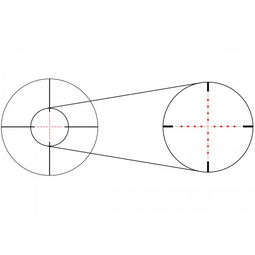 Прицельная сетка 2 (Mil-Dot), расположенная во второй фокальной плоскости (SFP), с увеличением кратности остаётся неизменно тонкой. При этом угловые размеры сетки пропорционально изменяются. Тонкие линии сетки не перекрывают даже самые маленькие цели на дальних дистанциях. Отстройка параллакса осуществляется кольцом на объективе прицела (AO) от 13,7 м. до бесконечности.