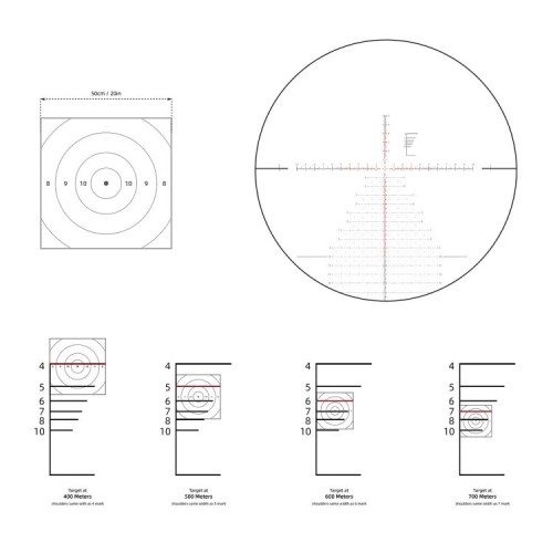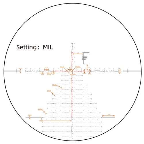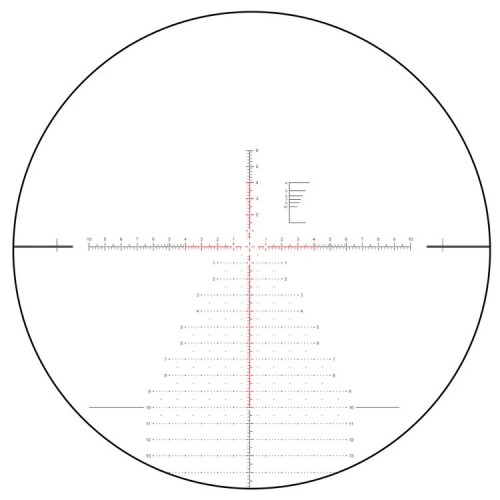 Сетка VEC-MBR2 (FFP, MIL) — улучшенная версия сетки VEC-MBR: учитывает больше тонкостей дальнобойной стрельбы на средних и больших увеличениях. Центральная «плавающая» точка 0,035 Mil предназначена для прицеливания по месту. Перекрестье, размеченное с шагом 0,2 MIL, и «ёлка» из точек позволяют легко вносить поправки на дальность, ветер и боковое движение без вращения барабанов. Шкала в верхней правой четверти работает как стадиометрический дальномер: помогает оценить расстояние до мишени размеров 50x50 см в пределах 400...10000 м. Находится в 1 фокальной плоскости: внешне — меняется, а угловые значения — верны при любой кратности. Разметка очень тонкая, чтобы не мешать прицеливанию и не перекрывать гонги на любой кратности.