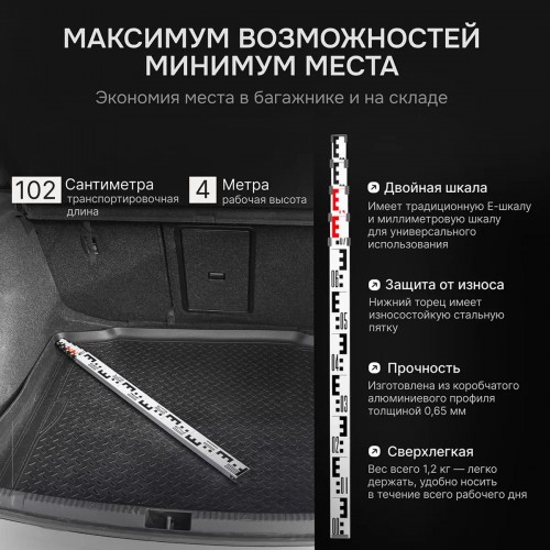 - Быстро складывающаяся конструкция, фиксируемая металлическими подпружиненными кнопками в разложенном состоянии, минимизирует время подготовки инструмента к измерениям и его приведение в транспортировочное положение, обеспечивая высокую оперативность работ.