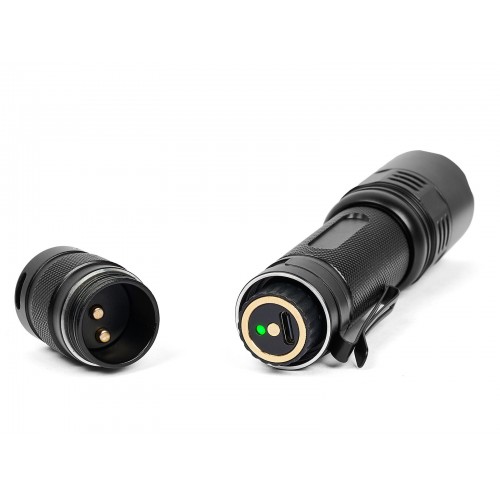 - Зарядка USB Type-c. Для повышения защиты от Влаги порт USB-С встроен под задней крышкой фонаря. Также рядом с портом USB-С под задней крышкой фонаря встроен индикатор заряда. При заряжании устройства, зеленый свет индикатора означает, что аккумулятор заряжен на 95 и более процентов. Красный свет индикатора = заряд аккумулятора меньше 95%