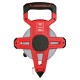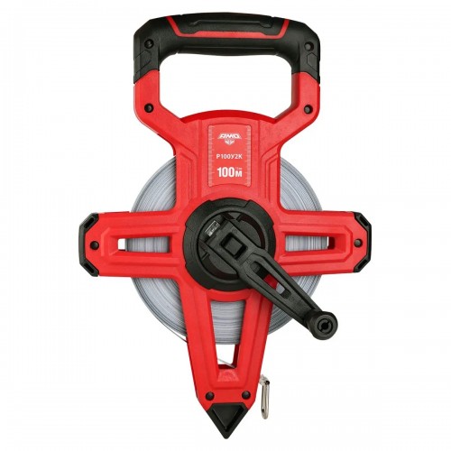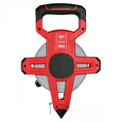 Открытый корпус, изготовленный из ударопрочного пластика с дополнительными накладками из термопластичной резины, за счет крестообразной формы надежно предохраняет измерительное полотно от физических воздействий при случайных ударах и падениях, и при этом обладает сравнительно небольшим весом. Верхняя часть измерительной рулетки для удобства удержания выполнена в виде закрытой ручки, а внизу предусмотрено заострение, позволяющее устанавливать инструмент над выбранной точкой. Вытяжной конец рулетки снабжен кольцом на торце для фиксации начала отсчета над выбранной точкой. Его можно также задействовать для крепления динамометра или груза, обеспечивая нормирование рабочего усилия натяжения измерительного полотна. Для ускорения сматывания стальной ленты служит редукторный механизм с ручным приводом.