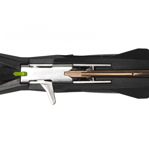 1. Ружье оснащается специальным гарпуном «ARES» ø6,5 мм на хвостовике этого гарпуна, есть выступ, который встает в паз верхней крышке спускового механизма. Все кто хоть раз охотился с арбалетом знают, что люфт гарпуна (право-лево) в спусковом механизме составляет 3-5 мм, что может негативно сказываться на точности выстрелы. За счет нового спускового механизма и специального гарпуна – эта проблема решена и теперь гарпун всегда стоит ровно по центру спускового механизма, что, несомненно, существенно увеличивает точность. При этом ружье ARES можно использовать с обычными гарпунами – просто в этом случае не будет работать функция центровки гарпуна.