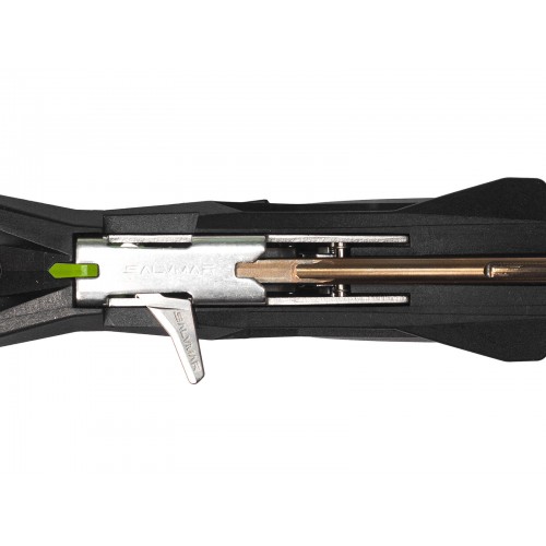 1. Ружье оснащается специальным гарпуном «ARES» ø6,5 мм на хвостовике этого гарпуна, есть выступ, который встает в паз верхней крышке спускового механизма. Все кто хоть раз охотился с арбалетом знают, что люфт гарпуна (право-лево) в спусковом механизме составляет 3-5 мм, что может негативно сказываться на точности выстрелы. За счет нового спускового механизма и специального гарпуна – эта проблема решена и теперь гарпун всегда стоит ровно по центру спускового механизма, что, несомненно, существенно увеличивает точность. При этом ружье ARES можно использовать с обычными гарпунами – просто в этом случае не будет работать функция центровки гарпуна.