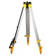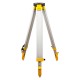 Алюминиевый штатив снабжен литой головкой из алюминиевого сплава, с верхней фрезерованной площадкой плоской формы, и пустотелым латунным закрепительным винтом с резьбой 5/8" x 11 мм. Фиксация ножек в рабочем положении производится с помощью зажимных винтов. Выступы на наконечниках в нижней части треноги позволяет заглублять их в грунт нажатием ноги с целью повышения устойчивости изделия. Желто-черно-серебристая расцветка делает аксессуар хорошо визуально различимым на любом фоне. В транспортировочном состоянии ножки скрепляются вместе с помощью ремешка, а закрепленный продольно ремень позволяет комфортно переносить инструмент на плече.