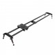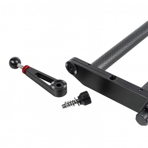 Слайдер для видеосъемки имеет легкий вес за счет карбонового исполнения направляющих. Рельсы длиной 1180 мм расположены на расстоянии 94 мм (по оси друг от друга). За счет оптимальной длины направляющих слайдер может применяться как в помещении, так и на выездных съемках.