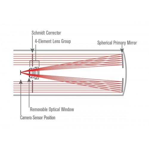 - В отличие от более крупных телескопов RASA, работающих с цифровыми зеркальными фотокамерами и большими ПЗС-камерами, 8-дюймовая модель была разработана для цветных астрономических КМОП-камер, небольших ПЗС-камер и беззеркальных камер. Телескоп не работает со стандартными цифровыми зеркальными фотокамерами.