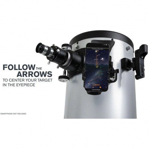 - Прочное основание в стиле Добсона с подшипниками большого диаметра и регулируемым натяжением по высоте позволяет легко следовать за стрелками на экране, пока вы не достигнете нужной цели. Когда мишень становится зелёной, она готова к просмотру в окуляре телескопа.