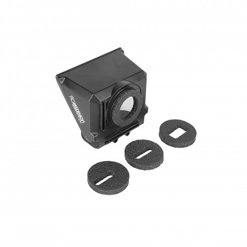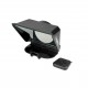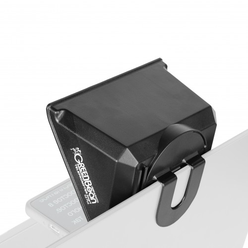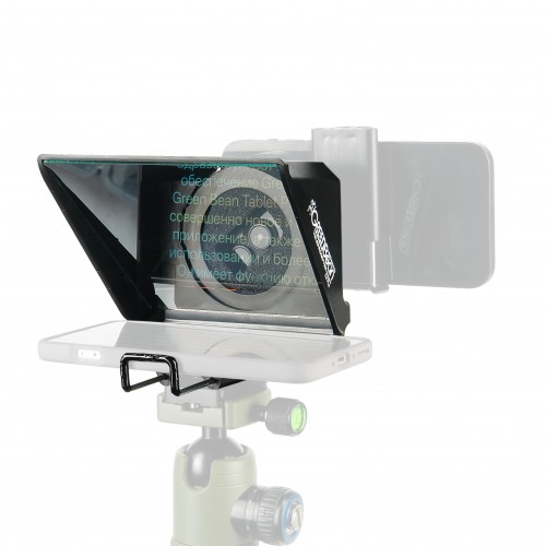 Внизу расположен держатель для смартфона диаметром 5,8" или менее, на который загружен подготовленный дикторский текст. Ширина площадки для смартфона варьируется от 6 до 9 см с помощью подвижного зажима, длина составляет 13 см. Между камерой и смартфоном расположен полупрозрачный экран из оптического стекла. Экран отражает изображение со смартфона, позволяя диктору видеть текст с расстояния до 3 метров. При этом оптическое стекло пропускает достаточно света, чтобы получить качественное видео без помех и искажений. Черный корпус и затеняющие кольца защищают камеру от боковой засветки и бликов.