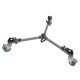 Тележка универсальная, с регулируемым положением упоров под размах ног треноги или стойки, подходит для крепления обычных (с резиновыми наконечниками) или шипованных (с двумя шипами) опор видеоштатива. Используется при различных видах видеосъемки – для плавных проводок в кадре по прямой траектории или дуге с разными радиусами, и в том числе для поворота камеры вокруг своей оси или съемки «одним кадром»