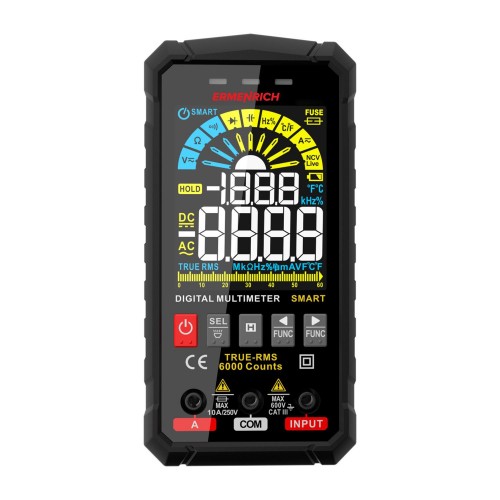 Ermenrich Zing TC26 – высокоточный цифровой измеритель силы тока, напряжения, частоты, а также сопротивления и емкости проводника. Кроме этого, с его помощью измеряют рабочий цикл и температуру, выполняют проверку кабельных линий на наличие обрывов, тестируют диоды для обнаружения обрывов и пробоев. С помощью функции NCV выполняют замеры напряжения без контакта с кабелем и находят скрытую проводку. Устройство подходит как для домашней диагностики проводки, так и для профессионального обслуживания электросетей.